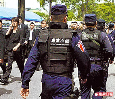 臺(tái)警方小組持槍在現(xiàn)場(chǎng)巡邏,并加強(qiáng)盤查青少年。 來(lái)源:臺(tái)灣《蘋果日?qǐng)?bào)》