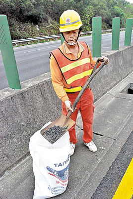 臺灣高速公路警方緊急出動清潔人員清除螺絲釘。 圖片來源:臺灣《中國時報》