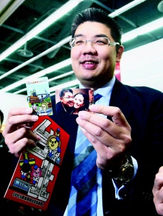 連戰(zhàn)長子、悠游卡公司董事長連勝文將請辭,圖為他出席icash悠游卡發(fā)卡儀式時,得意秀出私人訂制的與太太蔡依珊合照的悠游卡。資料圖片