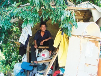 鐘德全(53歲)居住的樹(shù)屋只用簡(jiǎn)單的木棚和蚊帳搭成,四周散亂著回收的破敗家具和瓶瓶罐罐,蚊蠅飛舞。鐘德全坐在樹(shù)下的舊沙發(fā)上,燒木炭煮稀飯吃,不時(shí)有野狗在他身邊嗅來(lái)嗅去。