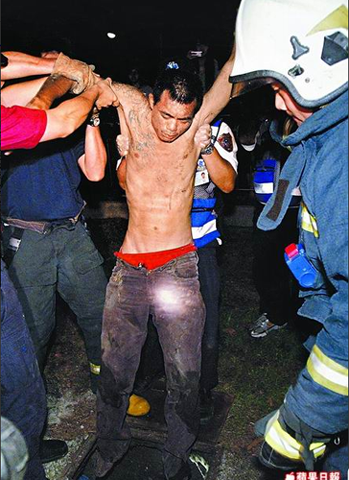 救援的警消無(wú)法鉆入,只能將頭伸入水溝內(nèi)對(duì)他喊話。圖片來(lái)源:臺(tái)灣《中國(guó)時(shí)報(bào)》