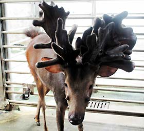 養(yǎng)鹿人家吳勝富所養(yǎng)三歲水鹿,昨天第二剪的鹿茸重達247.9臺兩,打破臺灣紀(jì)錄。圖片來源:臺灣《聯(lián)合報》
