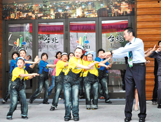 臺(tái)灣喜樂(lè)家族的唐寶寶、喜憨兒昨天在世博臺(tái)北館表演打擊樂(lè)與舞蹈,館長(zhǎng)陳慶安(前右)加入共舞。(圖片來(lái)源:臺(tái)灣《聯(lián)合報(bào)》)