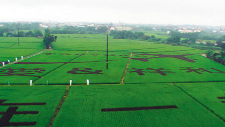 圖案出自苗栗農(nóng)改場(chǎng)博士張素真規(guī)劃設(shè)計(jì),在種植之前,必須先量字體所在地的經(jīng)緯度,還要從高處調(diào)整角度,充分利用兩種稻作不同顏色的對(duì)比,描繪出字樣及飛機(jī)圖案。