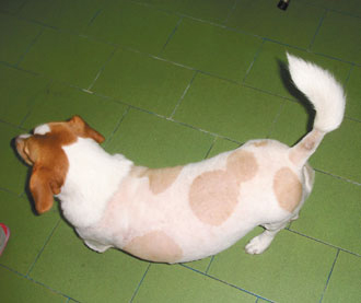 苗栗市永昌動(dòng)物醫(yī)院獸醫(yī)師徐錦源說,“阿肥”應(yīng)該是混種的米格魯犬,頸子有白色蝴蝶狀的鬃毛,軀體剃光的狗毛,有圓形的斑點(diǎn),相當(dāng)罕見。而狗尾部分,還特別留一段狗毛,造型特征確實(shí)讓人難忘。