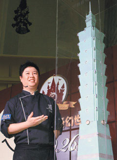 另外,由于101購(gòu)物中心是多層次建筑,所以李國(guó)溢除了最底層打造為實(shí)心,上面8層都是空心的,以免把下層的基底壓垮了。他采用黑巧克力制作,比較堅(jiān)實(shí)。最后再像女生化妝一樣,為大樓上色,因?yàn)椤昂诤诘牟缓每础薄?/P>