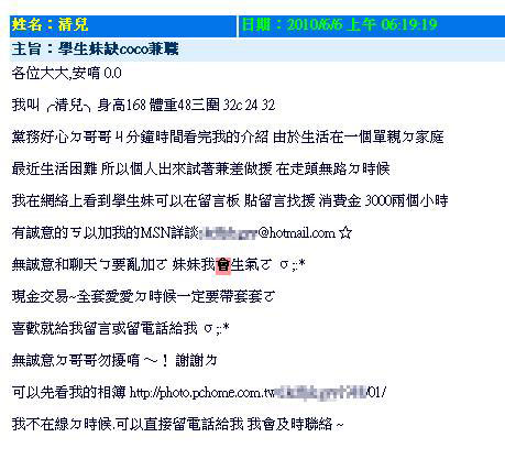 據(jù)報(bào)道,來到高雄縣教師會(huì)網(wǎng)頁,點(diǎn)進(jìn)留言板流覽,為人師表的空間怎么會(huì)有一則“援交”廣告?廣告上頭不但自稱是大二學(xué)生,還“男女不限”,因?yàn)槿卞X,希望大家“援助”。