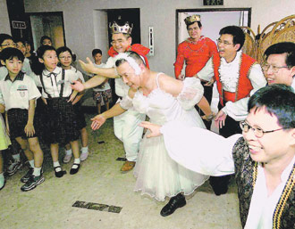 臺北一小學校長為了鼓勵小朋友暑假讀完十二本書,穿起天鵝湖的服裝跳給他們看,逗得學生大樂。圖片來源:臺灣《聯(lián)合報》