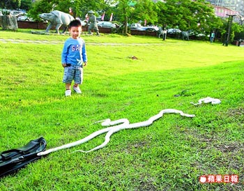 新竹縣男子李哲能,19年前開始培育白化臺(tái)灣南蛇當(dāng)寵物,常趁好天氣到文化中心草皮“遛蛇”,引來路人把玩,小朋友還要求父母買蛇回家當(dāng)寵物。