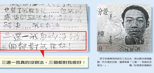臺北警方在陳尸現(xiàn)場找到一本林偉棟寫給很多人的遺書,包括他的父母、老板、同事及3名女朋友。林偉棟在遺書中,告訴老板:“我的感情問題,真的沒辦法解決,3選1,我真的沒辦法,3個都對我很好…”臺北檢警從林偉棟寫給3名女朋友的遺書內(nèi)容研判,林偉棟先結(jié)交甲女,又劈乙女,再結(jié)交丙女,他對乙女用情最深,還要求乙女不要恨甲、丙2女;警方認(rèn)為他同時劈3女曝光,3女要他做抉擇,他解不開這個難題,才走上絕路。(中國臺灣網(wǎng) 劉海偉)