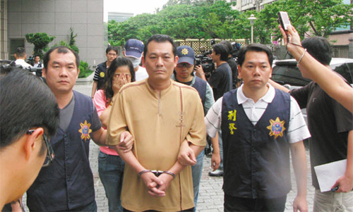 四海幫海竹堂副堂主彭國勝(穿黃衣)及妻子王麗蘭(其后掩面者)、大兒子彭依翰(王麗蘭后戴口罩者),因在竹東地區(qū)成立堂口放高利貸,遭刑警逮捕。圖片來源:臺灣《聯(lián)合報》