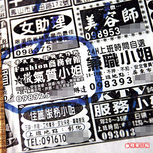 今年三月間,該集團為擴大公司陣容、吸收年輕美眉加入賣淫,在一份人力快報的報紙上刊登分類廣告,征求“氣質(zhì)小姐”,強調(diào)自由班、安全保密、工作輕松,單純陪客人聊天喝酒。