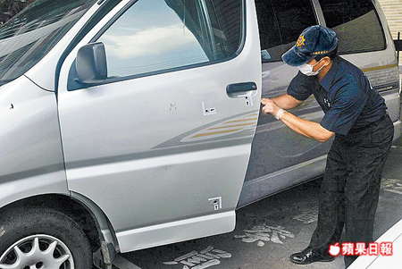 臺(tái)南警方偵防車被歹徒劫走,警察開槍圍捕,子彈貫穿偵防車車門。 來源:臺(tái)灣《蘋果日?qǐng)?bào)》