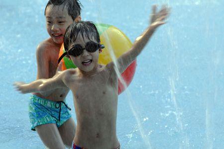 3日下午,臺北市最高溫達(dá)到攝氏38.6度,創(chuàng)今年入夏以來最高溫。自來水園區(qū)游泳池民眾帶小孩來戲水降溫。圖片來源:“中央社” 施宗暉 攝