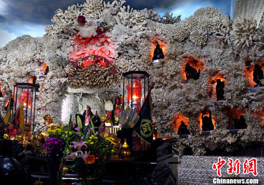 進入7月中下旬的臺灣富福頂山寺游客大增。這座寺廟位于三芝鄉(xiāng)橫山山上,據(jù)說是一位信徒從1996年起用上百種珊瑚與六萬多種貝殼堆砌而成,故又稱貝殼廟。此廟主奉祀濟公活佛和十八羅漢與圣母娘娘。廟堂建筑特別,色彩斑斕,猶如“海底世界”,慕名而來的香客游人絡繹不絕,香火旺盛。中新社發(fā) 宋吉河 攝