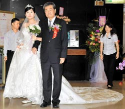 臺灣前竹聯(lián)幫幫主趙爾文24日晚間在臺北市王朝大酒店,舉行小女兒婚禮及自己70歲壽宴,趙爾文挽著愛女緩緩步入禮堂接受親友祝福。圖片來源:臺灣《中國時報》