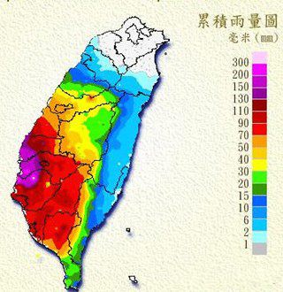 除新?tīng)I(yíng)降雨量達(dá)超大豪雨標(biāo)準(zhǔn)外,臺(tái)南縣北門(mén)鄉(xiāng)、嘉義縣義竹鄉(xiāng)東后寮降雨量為250.5毫米、240毫米,也已超過(guò)大豪雨標(biāo)準(zhǔn)(即24小時(shí)累積雨量200毫米以上)。此外,臺(tái)南縣下?tīng)I(yíng)鄉(xiāng)及嘉義縣樸子鄉(xiāng)降雨也逼近豪雨標(biāo)準(zhǔn)。