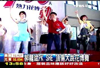 臺媒稱,臺北市長郝龍斌眼睛左瞄又瞄,跟著S.H.E大跳花博舞,不過舞步似乎不太熟,從頭到尾都小小的慢半拍,不過ENDING標準、ROCKER手勢,倒是相當(dāng)?shù)轿。臺北市長郝龍斌:“一般我是不太緊張的人,只有2件事情是絕對會讓我緊張,一個是唱歌,另外一個就是跳舞。”短短30秒的花博舞連跳6遍,讓郝龍斌市長跳得滿頭大汗。