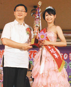 桃園縣長吳志揚(yáng)(左)頒發(fā)冠軍獎(jiǎng)座給第二屆桃園蓮花公主第一名張以欣(右)。圖片來源:聯(lián)合報(bào)