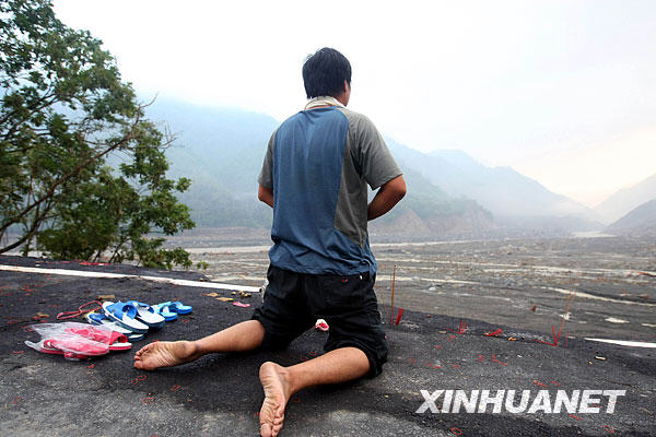 資料圖:2009年8月15日,一名遇難者家屬在被泥石流淹沒的小林村前祭奠。新華社發(fā)