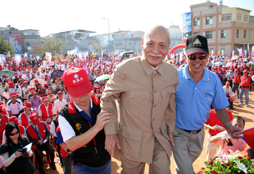 酷似蔣介石的李登科,成為臺灣吸引大陸觀光客的新武器。圖為李登科(中)2009年在金門為縣長參選人李沃士輔選時,民眾爭相目睹他風(fēng)采的情形。圖片來源:“中央社”