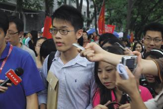 上午九點(diǎn)半,李戡在電視臺(tái)工作人員的陪同下現(xiàn)身,還沒(méi)走到經(jīng)濟(jì)學(xué)院報(bào)到,立刻被媒體團(tuán)團(tuán)圍住。不靠工作人員開(kāi)路,李戡根本走不到報(bào)到攤位。爭(zhēng)搶鏡頭的記者,差點(diǎn)擠倒了報(bào)到攤位的大陽(yáng)傘!安还苁钦l(shuí)的兒子,他就是個(gè)學(xué)生嘛”,旁邊的一位女同學(xué),忍不住搖頭抱怨。