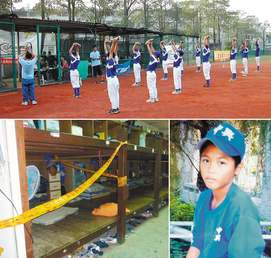 南投縣中興初中青少棒隊員蔡祥龍(右下圖),前天深夜在寢室(左下圖)跪坐在下鋪床板,以紅色尼龍布繩繞頸身亡。上圖為中興棒球隊之前練習的情形。(圖:臺灣《聯(lián)合報》)