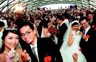 9月9日結婚大熱門,臺北市民聯(lián)合婚禮9日在花博園區(qū)舞蝶館舉行,163對新人秀出婚戒,幸福洋溢。 來源:臺灣《聯(lián)合報》