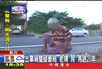 記者在彰化芳苑的大馬路邊,發(fā)現(xiàn)3、4只野狗圍著一個(gè)頭發(fā)斑白的老婆婆,她想閃躲,但似乎有困難,因?yàn)槔掀牌诺哪_嚴(yán)重萎縮,只能用爬的,而且一爬就是20多年。每天出門,老婆婆就在馬路上爬,旁邊車子一臺(tái)臺(tái)呼嘯而過,記者看了都替她捏把冷汗。