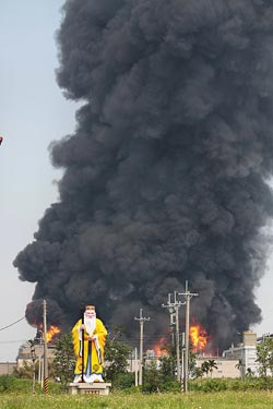 嘉義縣太保市的南亞塑料廠附近的一尊土地公身后,火海黑煙沖天。(圖:臺灣《中國時報》)