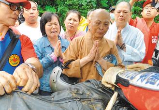 信眾見(jiàn)到寺廟的師父遺體被尋獲,雙手合十,送她最后一程。圖片來(lái)源:臺(tái)灣《聯(lián)合報(bào)》