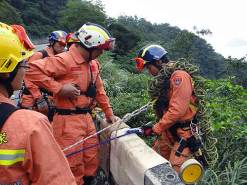 臺(tái)北市搜救隊(duì)24日挺進(jìn)蘇花公路116公里塌方處,搜救隊(duì)員從陡峭山壁垂降,搜尋生還者及車輛殘骸。圖片來源:“中央社”