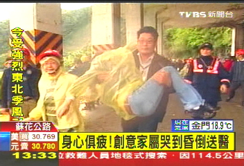 中國臺(tái)灣網(wǎng)10月27日消息 據(jù)臺(tái)灣TVBS電視臺(tái)報(bào)道,蘇花公路搜救行動(dòng)已進(jìn)入第7天,20名失聯(lián)大陸游客的任何消息都牽動(dòng)著他們家屬的心。焦急等待的心情加上惡劣氣候,使得一名創(chuàng)意旅行社失聯(lián)大陸游客家屬在今(27)日中午哭到昏倒,送醫(yī)救治。