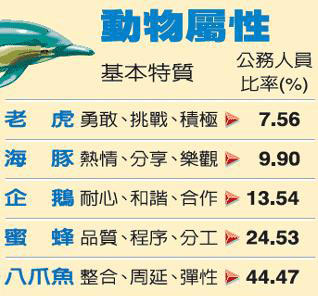 職能評鑒系統(tǒng)以老虎、海豚、企鵝、蜜蜂、八爪魚等五種動物屬性,代表五種公務(wù)員的人格特質(zhì)。圖片來源:臺灣《聯(lián)合報》