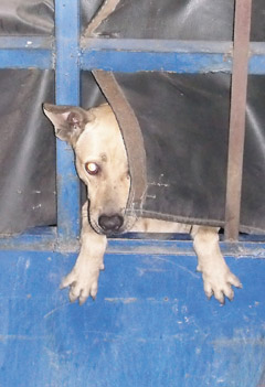黃色的小狗聽到聲音從鐵架門的帆布縫隙探出頭來。圖片來源:臺(tái)灣《聯(lián)合報(bào)》