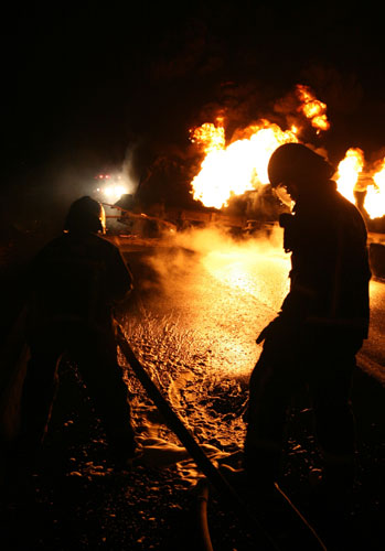 臺灣一輛載有對二甲苯的化學(xué)槽車17日凌晨行經(jīng)三號高速公路北上155.5公里苑里路段,撞上1輛轎車,翻覆滑落邊坡爆炸引發(fā)大火,警消出動搶救。 圖片來源:“中央社”