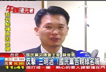 國民黨文傳會主委蘇俊賓表示,前臺灣地區(qū)領(lǐng)導(dǎo)人陳水扁判決定讞了,這時候來指控我們涉入司法,借由司法來操控選舉,我想是明顯妨礙我們名譽。(中國臺灣網(wǎng) 劉海偉)