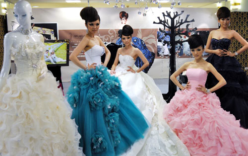 高雄市多家婚紗業(yè)者為迎接年底結(jié)婚旺季,24日在高雄市聯(lián)合推出2010秋冬時(shí)尚婚紗展,由模特兒走秀展示歐系時(shí)尚婚紗禮服。 圖片來(lái)源:“中央社”