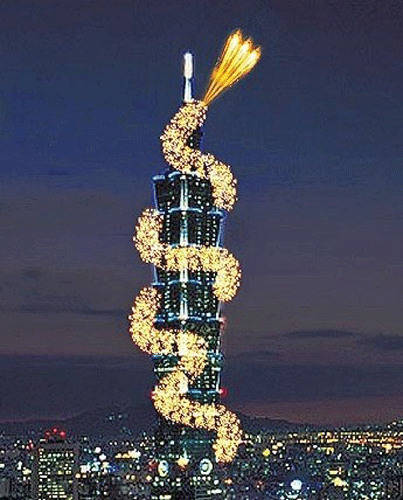 據(jù)臺灣《蘋果日報》報道,臺北101大樓跨年煙火秀將于三十一日登場,臺北101昨天(16日)首度公布煙火秀仿真圖案,其中一款“祥龍盤旋”營造出一尾金龍隨大樓建筑往上攀升、直到高五百零八米的塔尖處再噴出煙火的華麗壯觀感覺,呈現(xiàn)臺灣經(jīng)濟向上提升意向。煙火攝影達人建議,鄰近的新光三越A11頂樓空中花園、松仁路都是不錯的觀賞點。