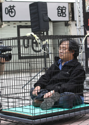 臺(tái)灣動(dòng)保人士黃泰山22日以自關(guān)狗籠禁食方式,呼吁民眾正視犬貓繁殖充斥黑心非法問題,以認(rèn)養(yǎng)代替購買,別成為黑心繁殖場幫兇。