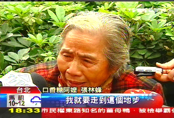 今年8月份,依舊在臺北車站附近擺地攤的她突然碰上劉姓、陳姓男子伸手搶糖,2男子稱若不給東西就拿150元新臺幣“交!,若堅持不拿錢,就把她給打死,還把輪椅掀翻。張林蜂老婦哭訴道,她有時一天還賺不到50元新臺幣,還要負擔(dān)龐大醫(yī)藥費,實在是“沒法給”。張林蜂老婦表示,幸好遇見路人見義勇為將2人擒獲,并送交警方,要不然她真的不知道該怎么辦了。