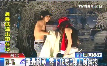 據(jù)臺(tái)灣TVBS報(bào)道,這2天臺(tái)灣天氣冷,但有情侶偏偏就愛酷寒的氣候,在極地挑戰(zhàn)擁抱最久的比賽。