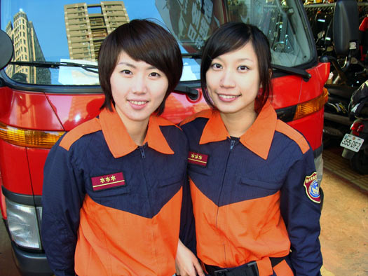新北市消防月歷一改過去北縣消防月歷偏重猛男的陽剛走向,首次加入女消防員,增添柔美及吸睛效果。圖為1月分的柯姿吟(右起)、劉欣宜,二人頗有明星臉。