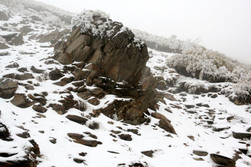 寒流發(fā)威,高山一夜間白了頭。臺(tái)灣玉山氣象站表示,合歡山及玉山26日凌晨都飄降瑞雪,合歡山從臺(tái)14甲線昆陽以上就可看到雪。圖為昆陽一帶的巖壁一片銀白景色。 圖片來源:“中央社”