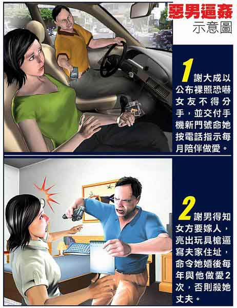 法院審理期間,謝大成曾在法庭上表示,10年來(lái)2人一直維持男女朋友關(guān)系,且常互通電話,是被害人另外偷交新男友,自己絕沒(méi)有用裸照強(qiáng)逼對(duì)方發(fā)生性關(guān)系。被害人則向法官哭訴這些年過(guò)得很痛苦,性愛(ài)時(shí)間都是他(指謝)在規(guī)定,本想時(shí)間一過(guò)此事就算了結(jié),未料謝大成逼她做性奴長(zhǎng)達(dá)10年。前年4月,她本打算結(jié)婚,但謝大成拿玩具槍恐嚇?biāo)楹笕皂毭磕旰推渥鰫?ài)兩次,否則將殺害她的丈夫!