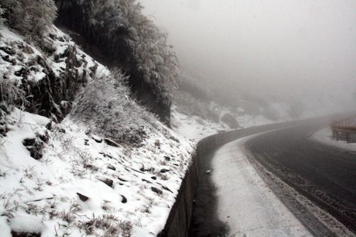 元旦寒流來襲,當(dāng)天清晨五點(diǎn)合歡山出現(xiàn)-9.1度低溫,但因干冷,游客等了一整天,未等到今年首場瑞雪。昨天上午九點(diǎn)起,合歡山區(qū)雨勢不斷,間歇降下比米粒小的冰霰;十點(diǎn)四十五分雨勢暫歇,冰霰轉(zhuǎn)成片片雪花,松雪樓到武嶺間的合歡山公路,短短三十分鐘內(nèi)變成銀白世界。