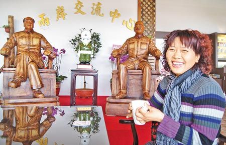 看好大陸游客到桃園兩蔣文化園區(qū)旅游商機(jī),業(yè)者藍(lán)鳳標(biāo)謝求香夫妻倆與人合資,花了2000萬(wàn)(新臺(tái)幣,下同)在慈湖雕像園區(qū)旁蓋了一棟觀景臺(tái),站在二樓窗邊,可以俯瞰園區(qū)整片蔣介石雕像,各種姿態(tài)都有,但園區(qū)上百尊蔣介石雕像,遠(yuǎn)不如她們的“店內(nèi)之寶”——毛澤東、蔣介石雕像。
