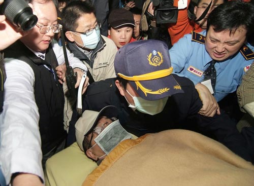陳水扁因心臟問題,上午被送往桃園醫(yī)院戒護外醫(yī)。陳水扁躺在推床上,戴著口罩,雙眼緊閉,沒有說任何話。