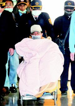 陳水扁19日上午7點25分在警方戒護下,搭乘臺北監(jiān)獄救護車前往桃園醫(yī)院,他全身被毛毯包住,躺在擔(dān)架上,只露出所戴的帽子和口罩。