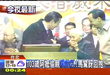 中國臺灣網(wǎng)1月23日消息 據(jù)臺灣TVBS電視臺報道,馬英九昨天(22日)傍晚和獨居老人溫馨圍爐大團圓,親手包刈包給老人吃,還被103歲的人瑞阿嬤偷吻。馬英九驚訝之余,感動地擁抱阿嬤。阿嬤則說,她才是老人,在她眼中,小她40歲的馬英九就像孩子。(中國臺灣網(wǎng) 吳斌)